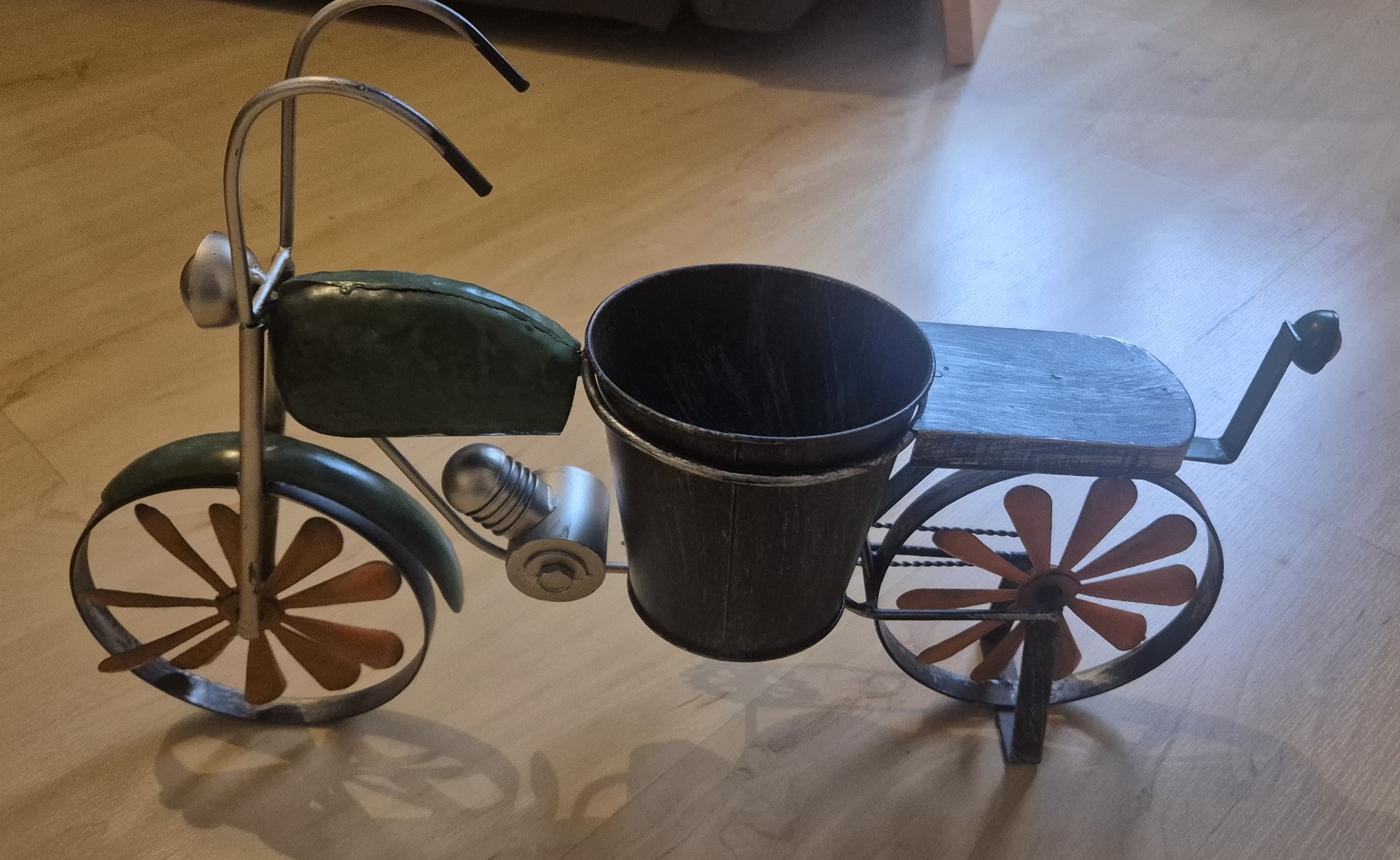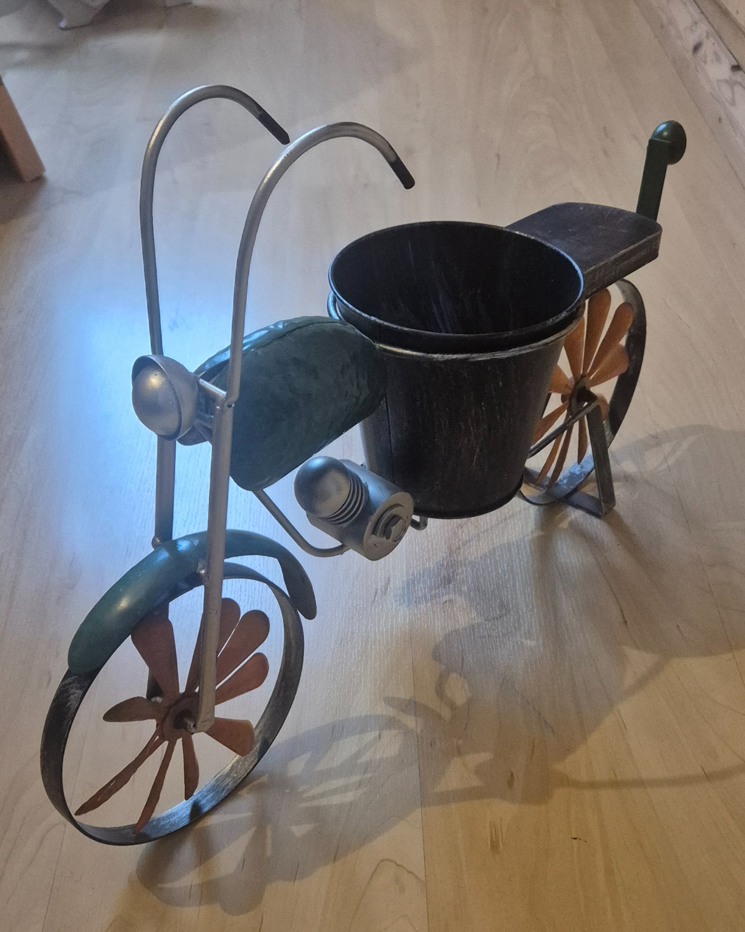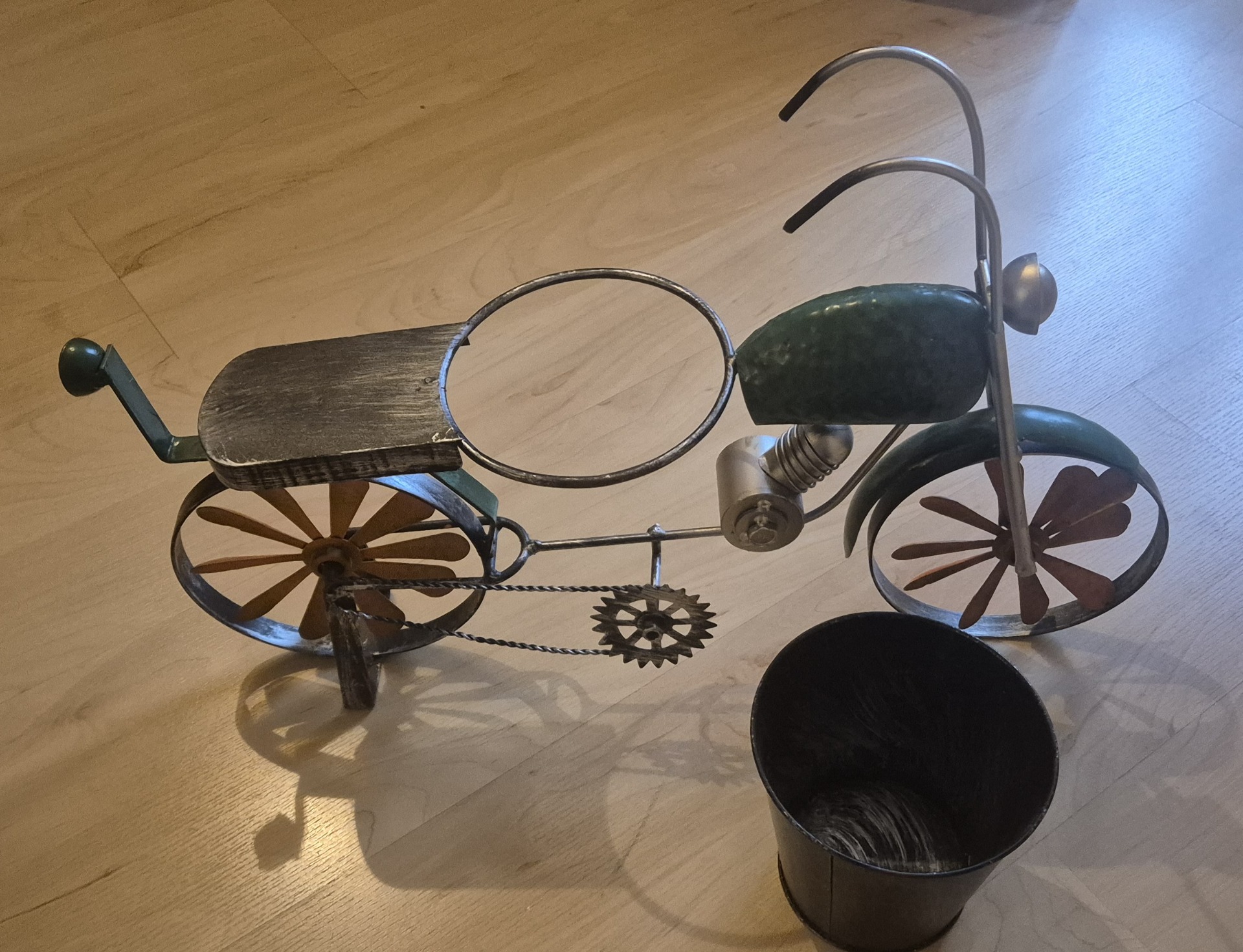 Bike aus Blech mit Blumentopf in der Mitte. Der Hinkucker. Die Räder sind als kleine Windräder ausgearbeitet. Ein nicht alltäglicher Blickfang.
