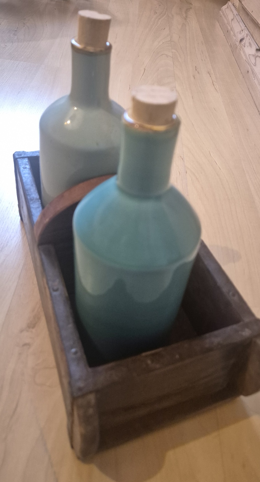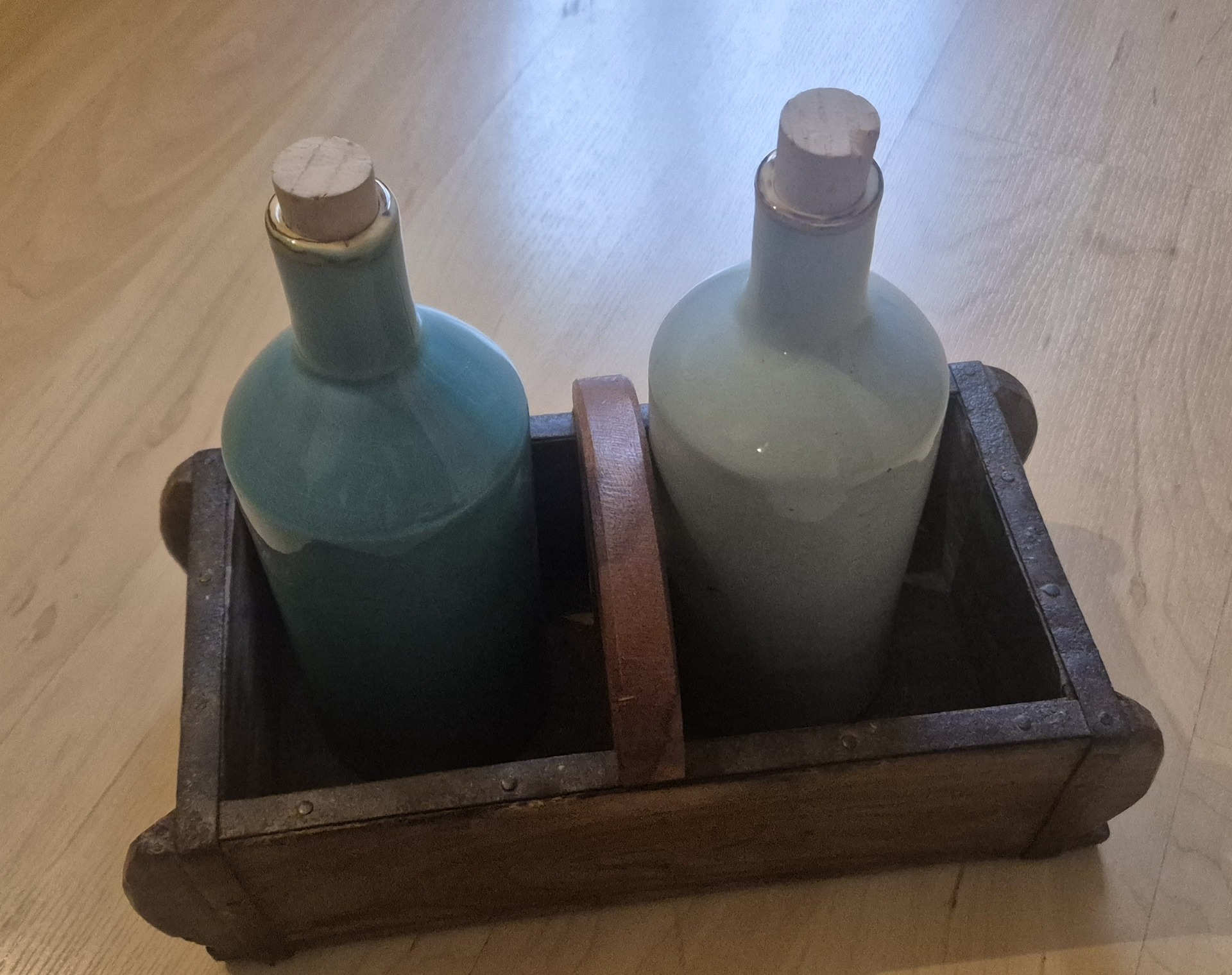 Die beiden Flaschen können für Oel und/oder andere Flüssigkeiten verwendet werden. Aus Keramik gefertigt und noch nie verwendet. Kork ist noch ganz neu. Die Holzkiste ist eine antike Ziegelstein-Form. Der Griff wurde nachträglich eingebaut. Grösse Holzkiste Breite 14 cm, Länge 30 cm. Inhalt Flaschen 3 dl.